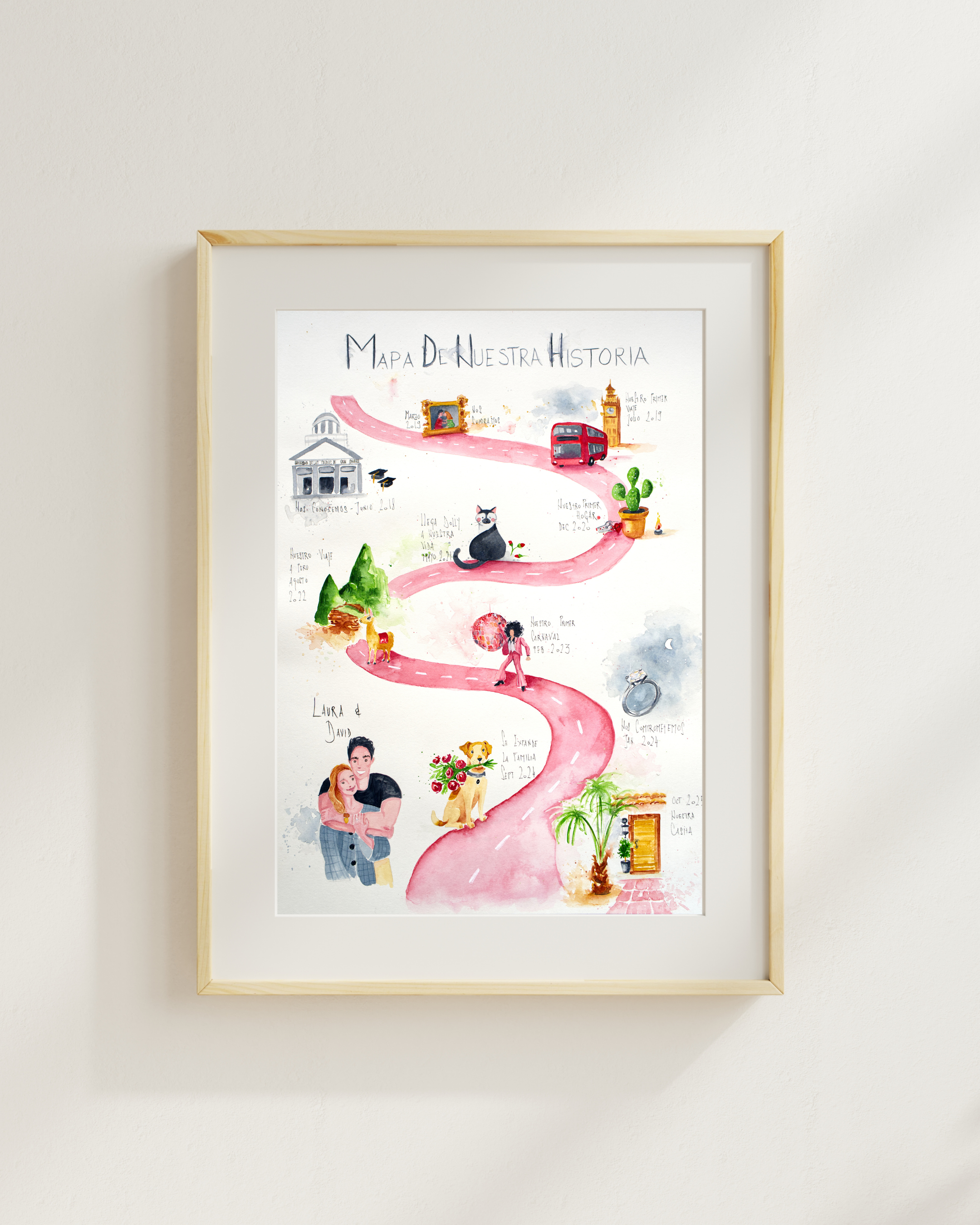 Un mapa artístico original en acuarela que recorre hasta 10 hitos del camino de la pareja: dónde se conocieron, su primer viaje, los lugares que marcaron su historia… hasta llegar al gran día.