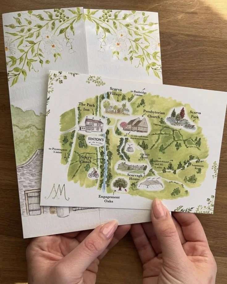Un mapa ilustrado a mano del lugar de la boda (la isla, la finca o el espacio) que sirve como guía artística para los invitados. Entregado en formato digital para incluir en las invitaciones.