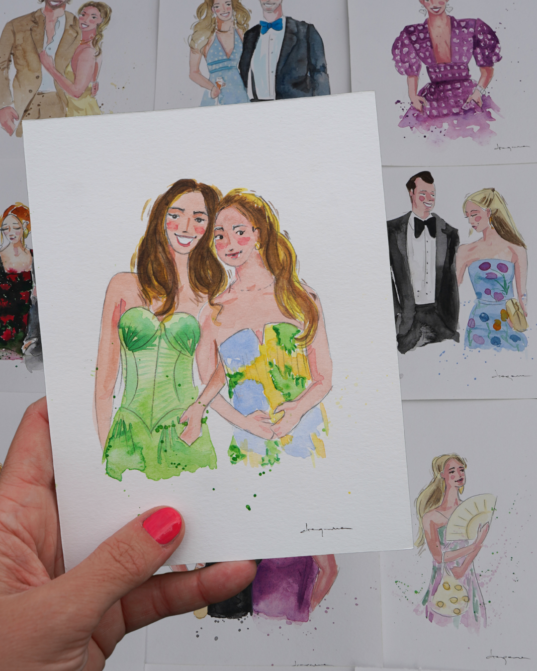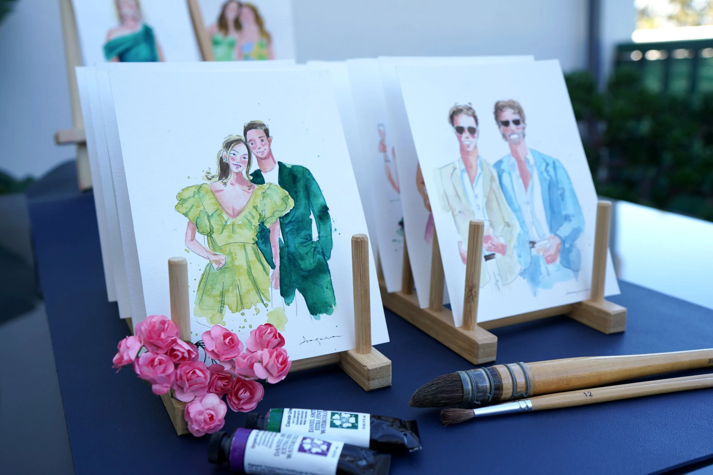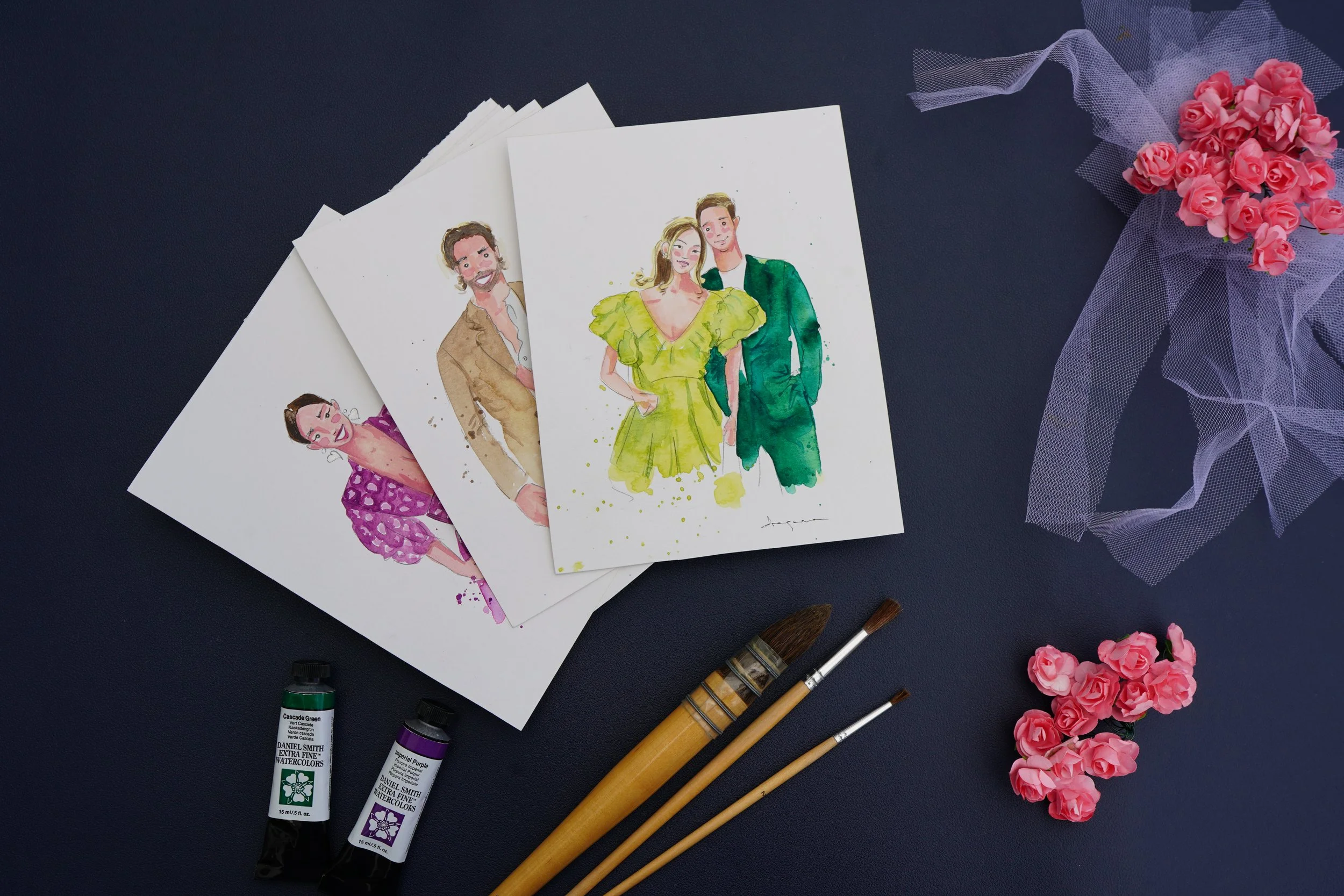 Durante la celebración, pintamos retratos en acuarela al instante como tarjetas de agradecimiento únicas y personalizadas para cada invitado. Un recuerdo irrepetible que se llevan a casa ese mismo día.
