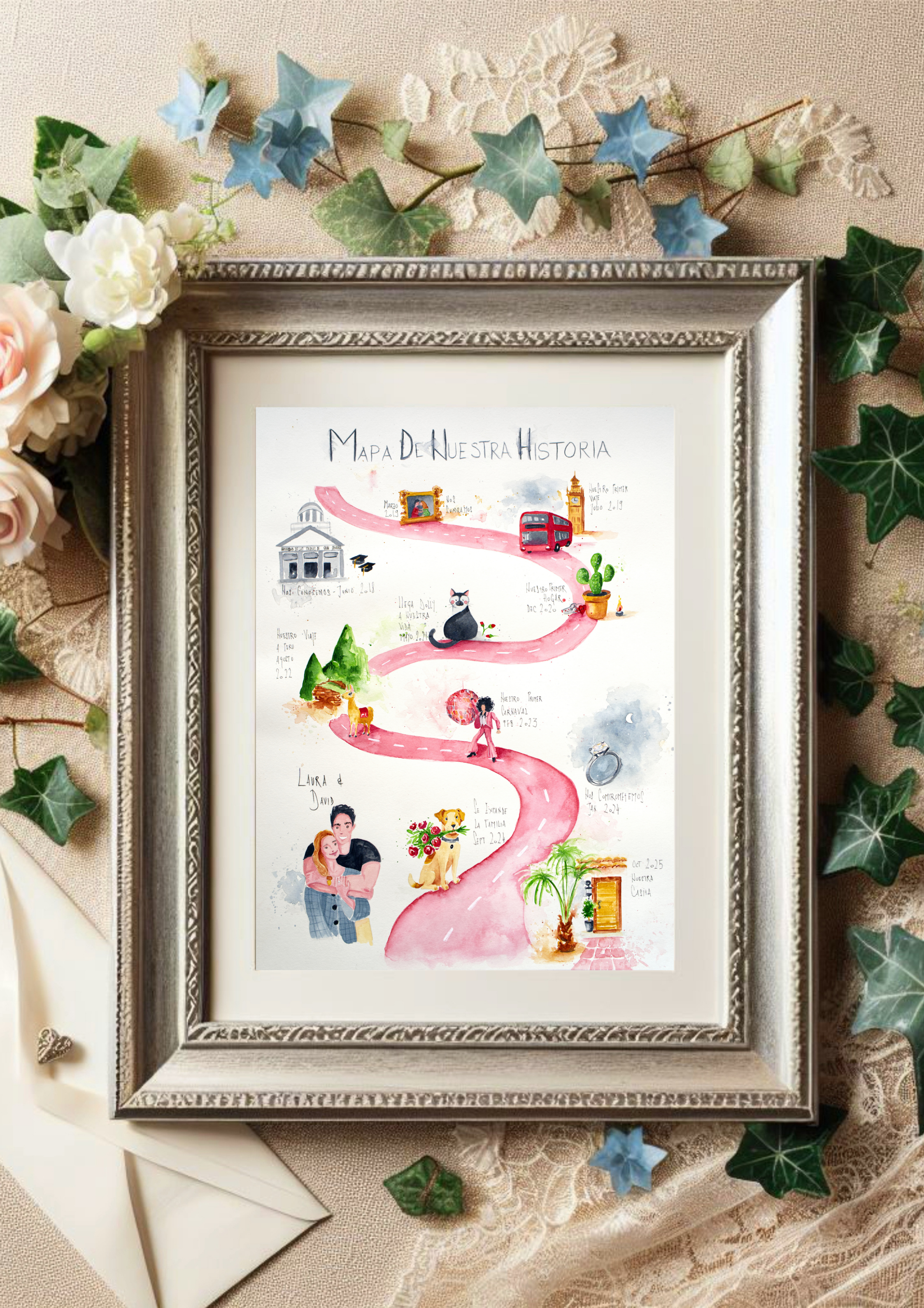 Un mapa artístico original en acuarela que recorre hasta 10 hitos del camino de la pareja: dónde se conocieron, su primer viaje, los lugares que marcaron su historia… hasta llegar al gran día.